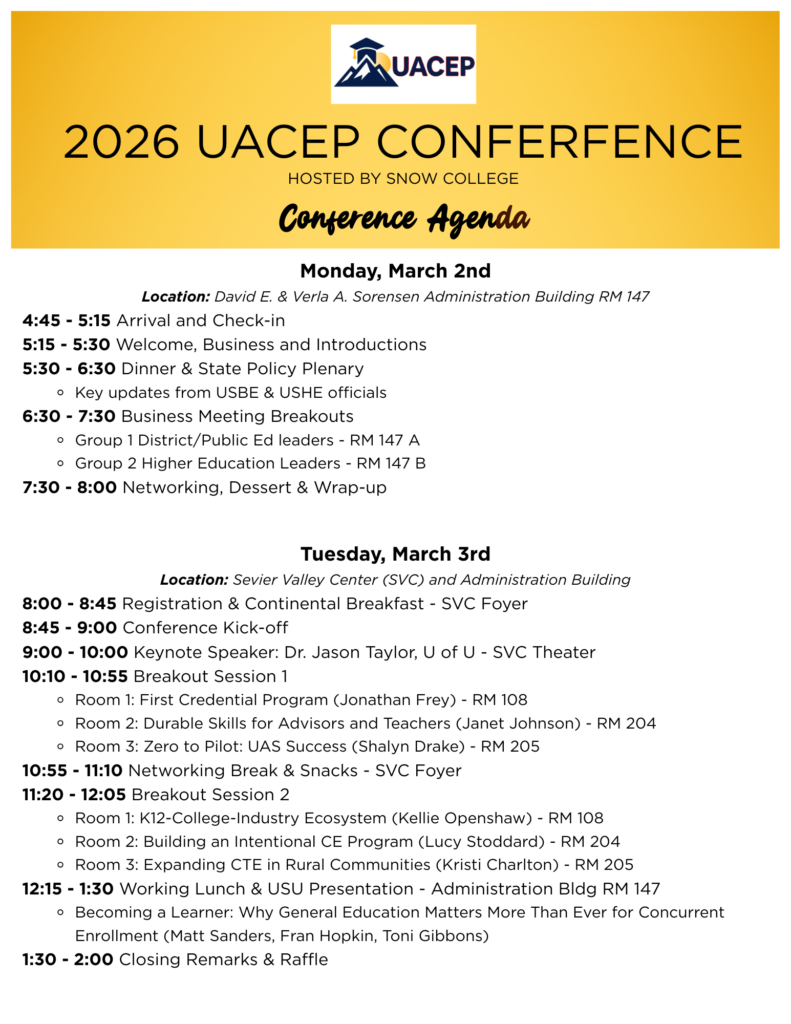 The official registration for the 2026 UACEP Spring Conference hosted at Snow College in Richfield, UT, is now OPEN!